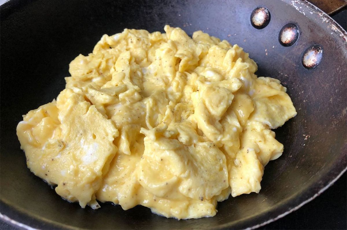 - Con una espátula, ir moviendo el huevo desde afuera hacia el centro, cada 5 segundos, en una acción continua, hasta que se logre una consistencia esponjosa.