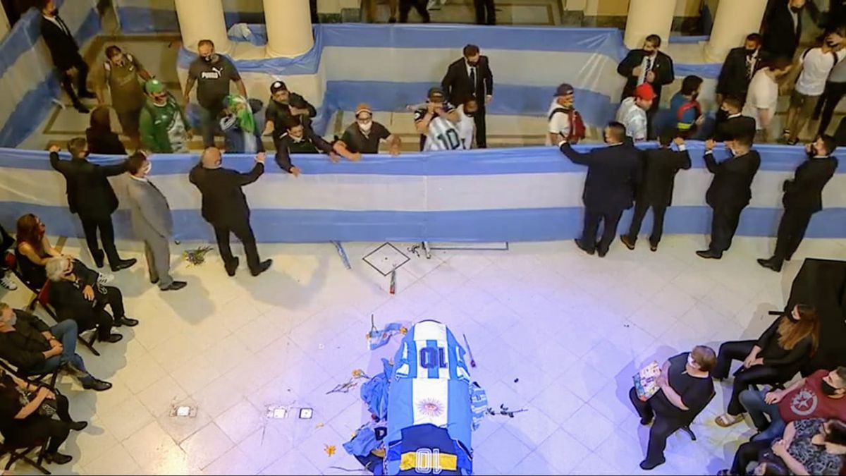 Por ese motivo, se anunció la extensión hasta las 19, sin embargo, los fanáticos forzaron el ingreso a la Casa Rosada. Por seguridad, el féretro de Maradona su cambiado de salón Pueblo Originarios.