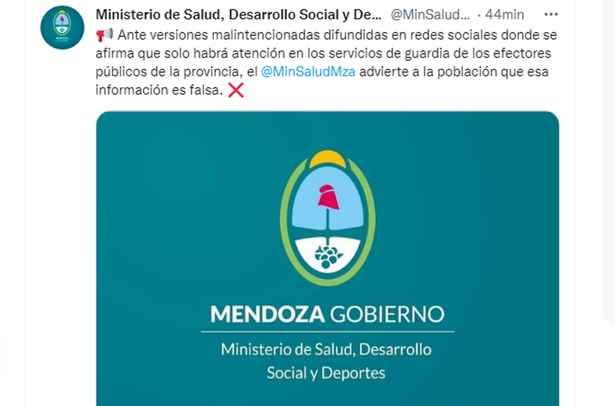 La cartera sanitaria aclaró a la población por las redes sociales, vía Twitter, que desde este organismo no salió la versión de que no habrá atención en las guardias de los centros de salud, y que esa información es falsa. Además aseguraron que la atención será normal, aunque dependerá del grado de acatamiento a la medida de fuerza del personal de salud.