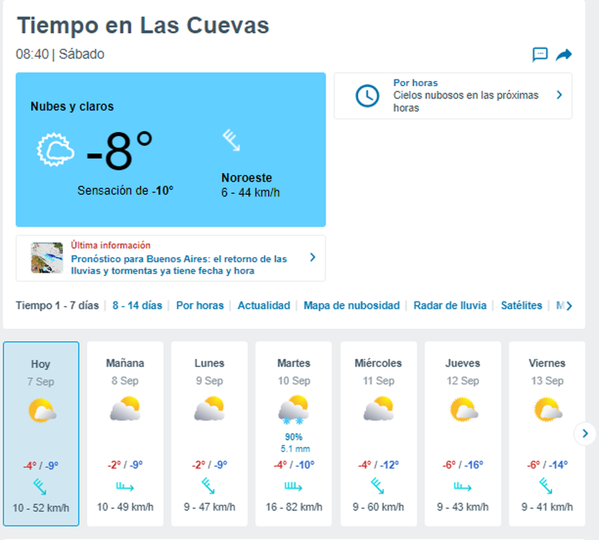 En cuanto al pronóstico extendido, si bien desmejoran las condiciones del tiempo este martes 10 de septiembre, el resto de los días el tiempo parece estar de parte de quienes tengan que viajar, pero siempre con temperaturas máximas bajo cero.