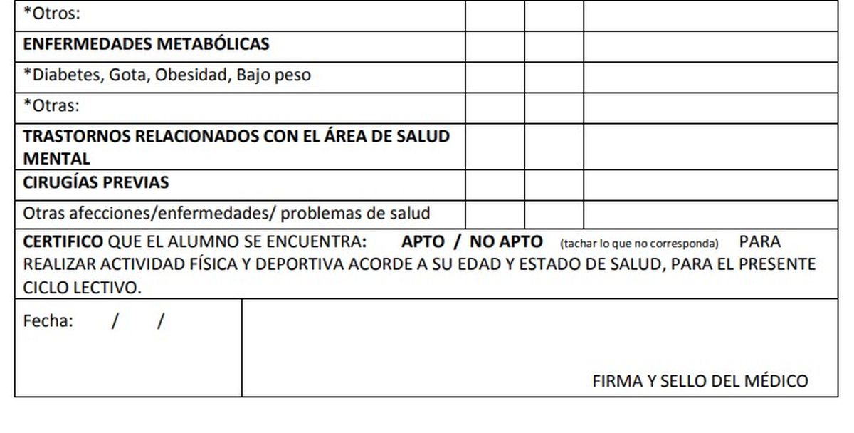 Y en otras, si bien no medió un mensaje en particular dirigido a los adultos, tomaron decisiones tajantes desde este lunes como no permitir la realización de actividad física a los alumnos que no presentaron los papeles o, directamente, cancelar la clase de Educación Física hasta contar con todas las fichas médicas del grado o curso.