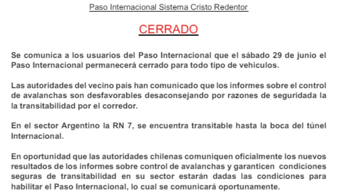 Badaloni manifestó que la decisión de mantener el túnel cerrado fue tomada unilateralmente por las autoridades chilenas en un inexplicable contexto. Esto porque las condiciones del tiempo son muy buenas este sábado y además, porque el paso de los camiones ayuda a mantener la calzada caliente.