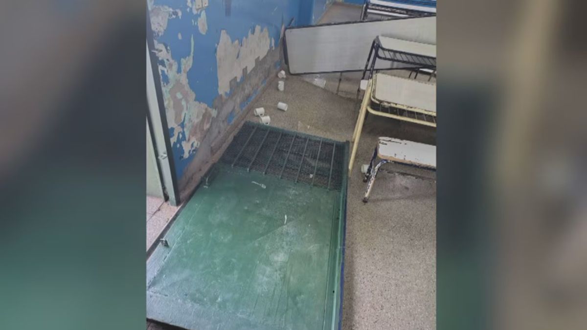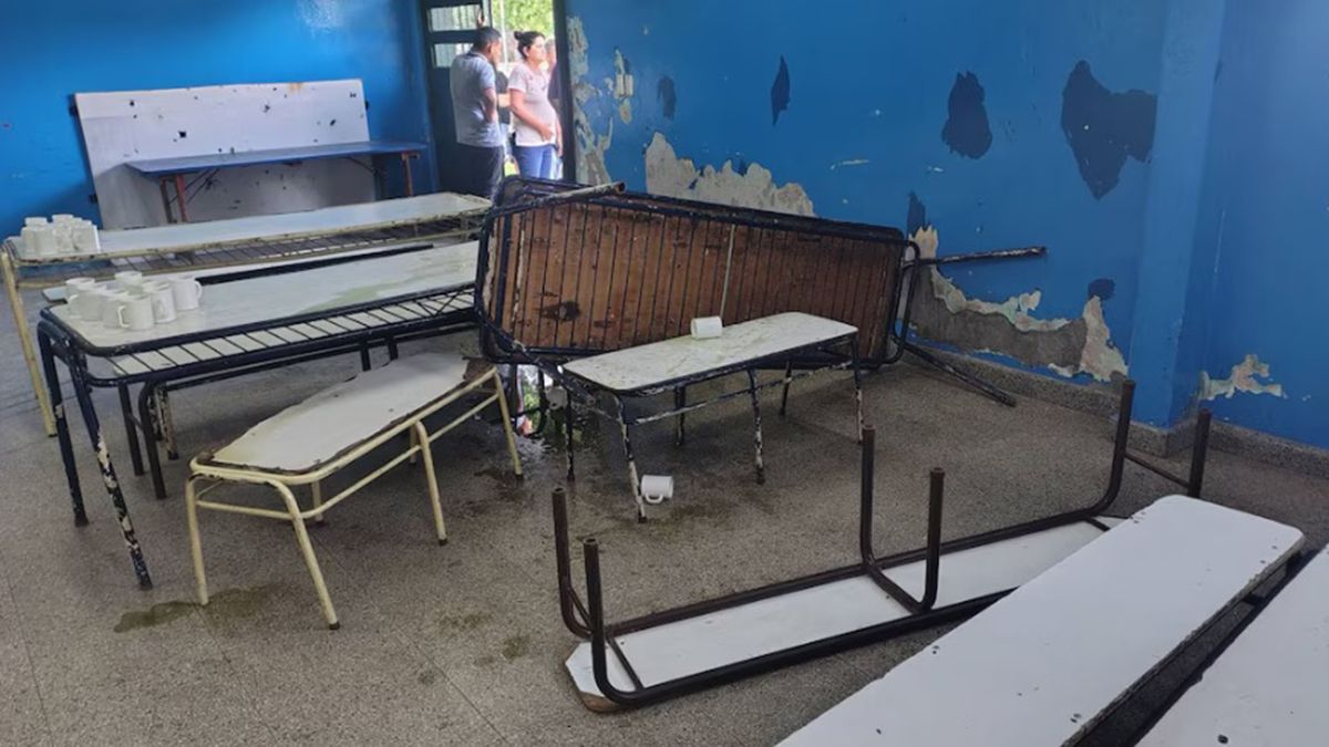 El portón del comedor, que separa los distintos niveles, quedó destruido al igual que las mesas que los chicos utilizan para almorzar y merendar. Mientras que las bebidas quedaron volcadas en el piso, en tanto que los platos y vasos fueron destruidos.