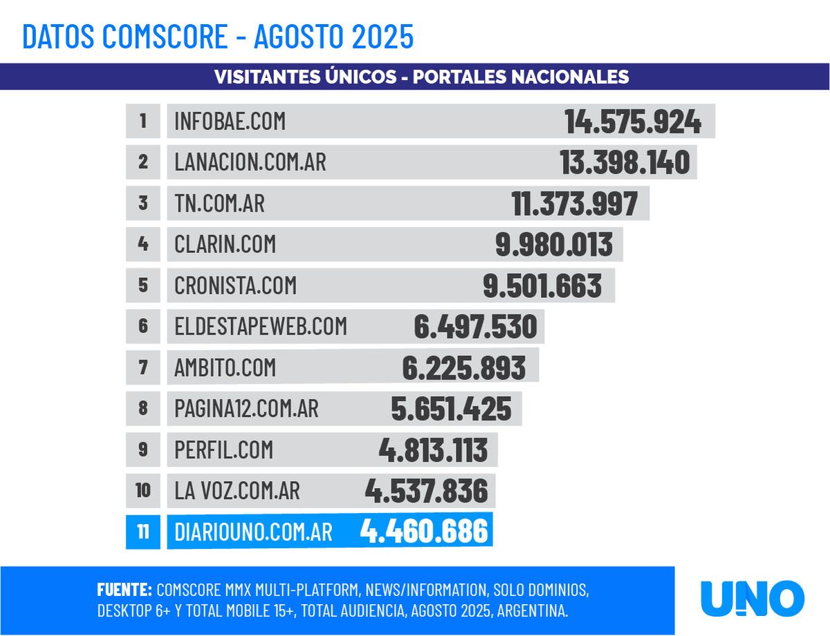 El informe, que audita la performance de los sitios digitales a nivel global, confirmó a Diario UNO en el lugar número 1 entre los medios de comunicación provinciales y número 11 a nivel nacional, compitiendo con diarios del prestigio de Infobae, Clarín, La Nación o El Cronista, entre otros.