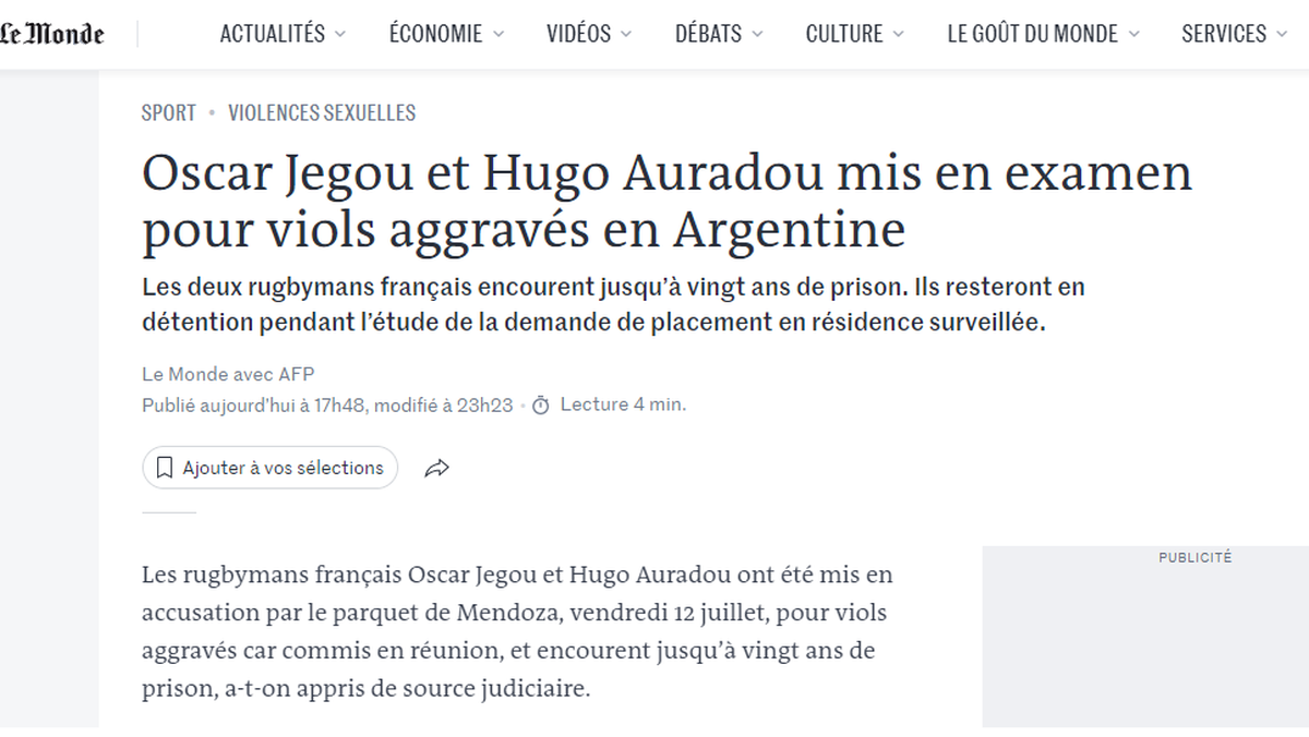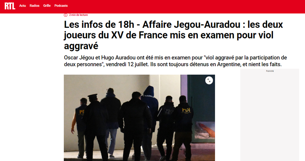 Los medios de comunicación de Francia siguen el minuto a minuto de la situación de los rugbiers franceses acusados de abusar sexualmente de una mujer durante su estadía en Mendoza. Los portales galos se hicieron eco en las últimas horas de la imputación formal para Hugo Auradou (20) y Oscar Jegou (21), que se concretó este viernes en la mañana.