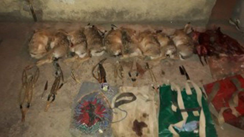 Después lograron realizar el control correspondiente determinando que sobre la parte de la caja de carga se encontraban los cazadores que llevaban 14 liebres y elementos como cuchillos y gomeras, junto a varios perros de la raza Galgos.