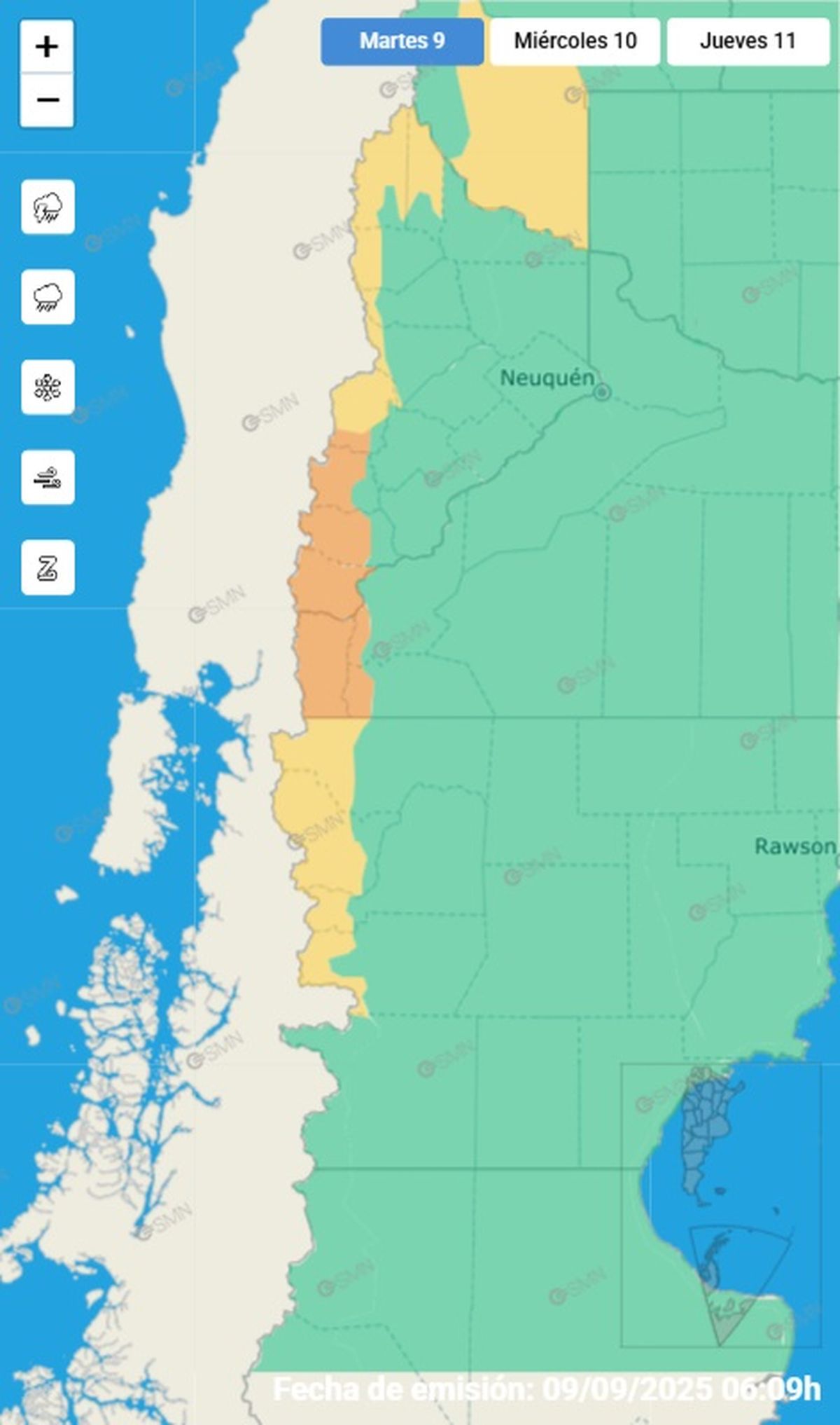 El Servicio Meteorológico Nacional emitió una alerta naranja por la llegada de fuertes lluvias y nevadas en las provincias de Neuquén y Río Negro. El área será afectada por lluvias, pudiendo ser algunas localmente fuertes. Se estiman valores de precipitación acumulada entre 40 y 60 mm, pudiendo ser superados de manera puntual. No se descarta la posibilidad de lluvia y nieve mezclada en las zonas más altas.