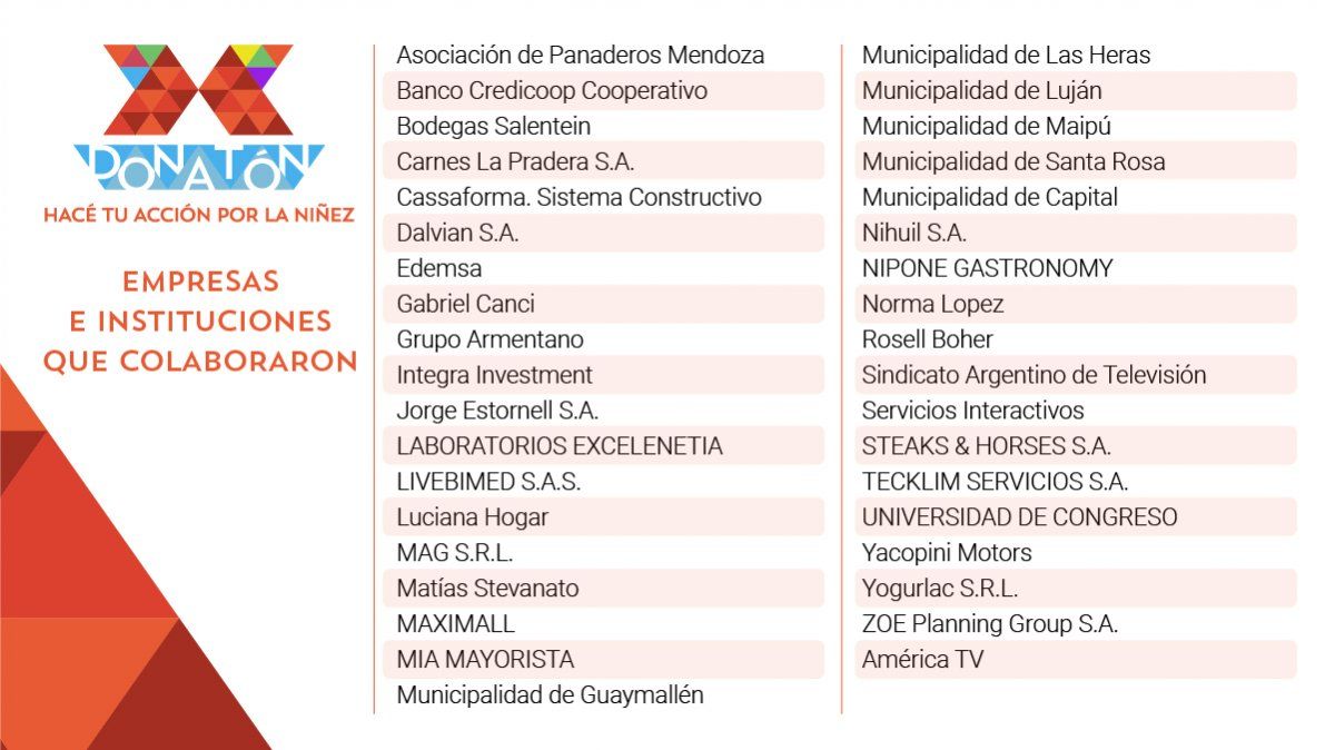 La mega acción solidaria que emprendió la Fundación Grupo América en alianza con la ONG internacional Aldeas Infantiles SOS organizadoras de la DONATÓN "Hacé tu acción por la niñez", logró recaudar $6.030.000 entre los aportes que efectuaron 37 empresas e instituciones y las micro donaciones de miles de mendocinos.