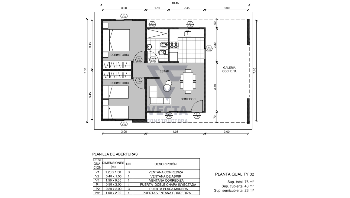 Esta casa prefabricada que se vende a 19.900 dólares posee un diseño muy moderno y tiene dos dormitorios, un baño, cocina, comedor, estar y una galería que puede funcionar como cochera. Todo en 76 metros cuadrados, de los cuales 48 son cubiertos y 26 semi cubiertos.