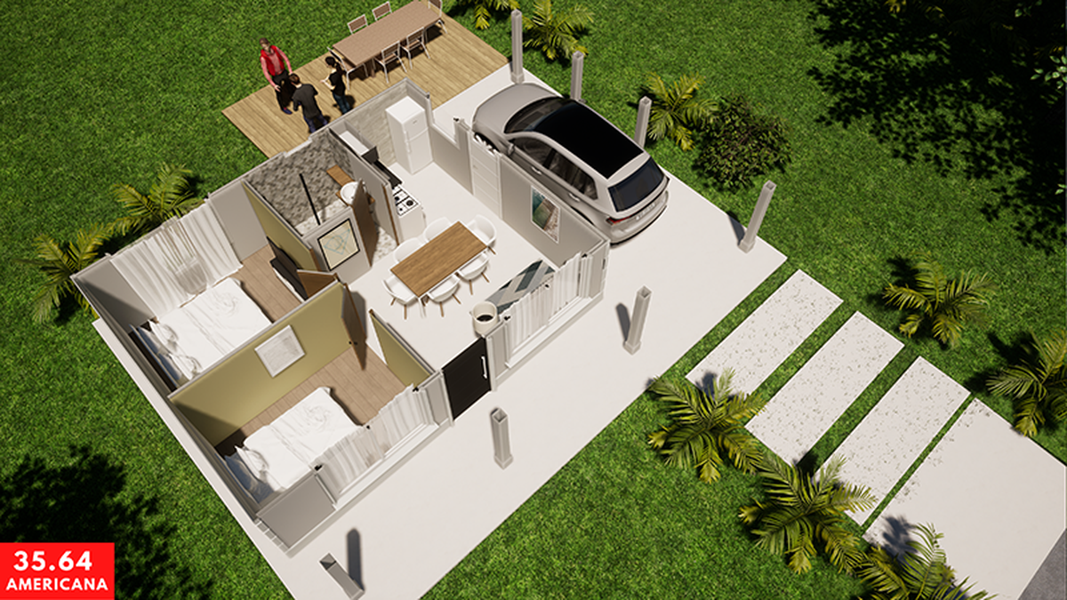 Esta casa prefabricada tiene, según la descripción que hace la empresa en su sitio web, dos dormitorios, treas ambientes y un baño al estilo americano.