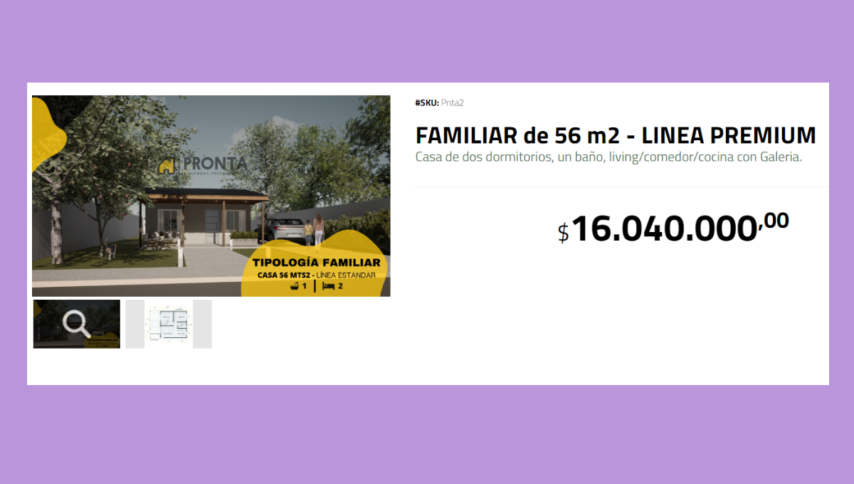 Una casa prefabricada tiene varias ventajas, pero la que más seduce es su precio, en comparación con las viviendas tradicionales. No es el único, su variedad de modelos y la rapidez con la que se pueden construir y habitar son algunos de los otros atractivos que poseen este tipo de viviendas. Un ejemplo de ello, es este modelo de la empresa Pronta, que se vende a $16.040.000, cifra que en dólar blue equivale a 13.500 dólares.