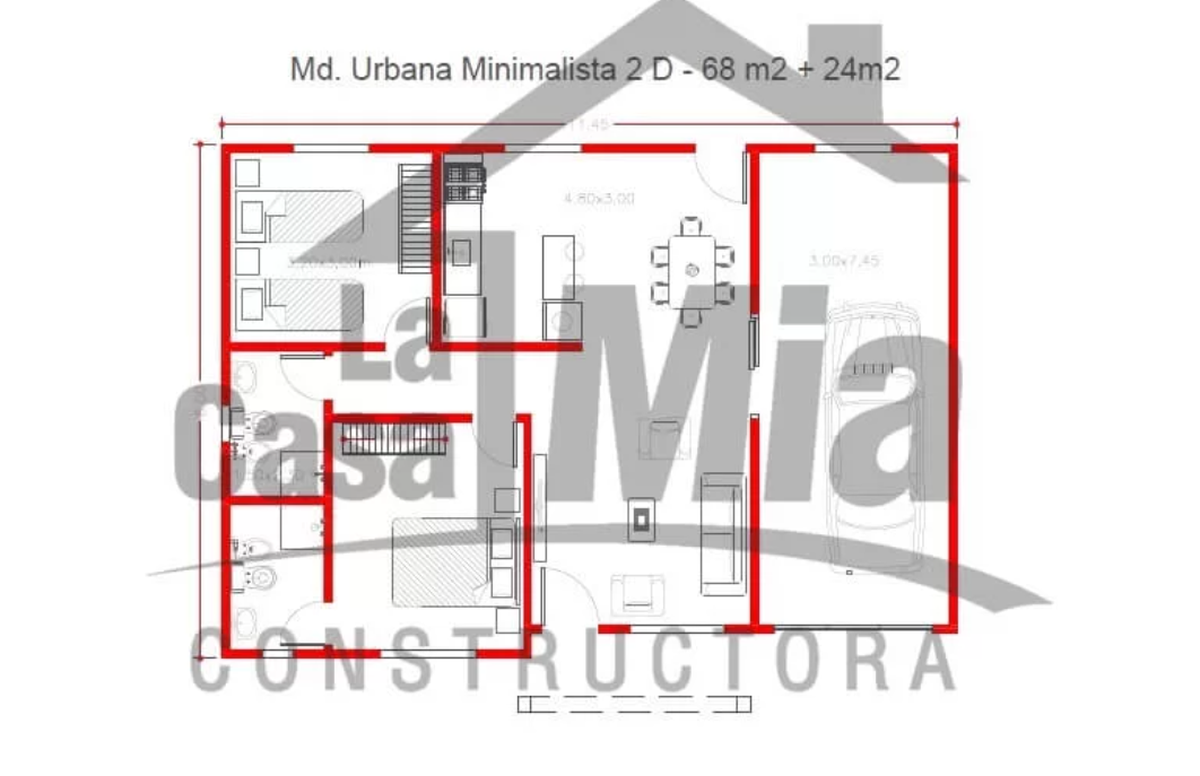 Esta casa prefabricada divide sus 92 metros cuadrados en 68 cubiertos y 24 para una cochera. Tiene dos habitaciones, un baño en suite y un baño general, más una cocina-comedor y un living.