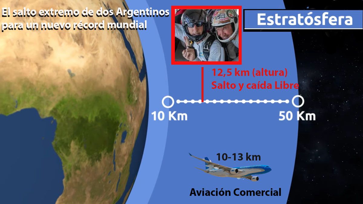 Con una larga trayectoria, Alejandro Montagna y Marcelo Vives son los paracaidistas argentinos que rompieron un récord mundial de salto nocturno desde gran altitud, al arrojarse en caída libre desde la estratósfera, a 13 mil metros de altura.