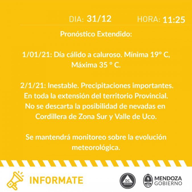 Defensa Civil emitió un alerta por el pronóstico del tiempo para Mendoza por este viernes 1 de enero y el sábado 2 de enero. Se vienen tormentas y nevadas