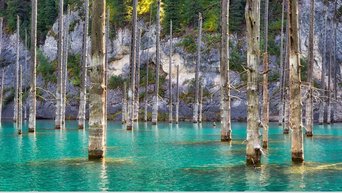 El Lago Kaindy es un lugar natural fascinante ubicado en las montañas Tian Shan, al sureste de Kazajistán, a unos 130 km al este de Almatý. Este lago es famoso por su bosque sumergido, donde los troncos desnudos de los árboles de Picea schrenkiana (abeto de Schrenk) emergen de las aguas turquesas de manera impresionante.