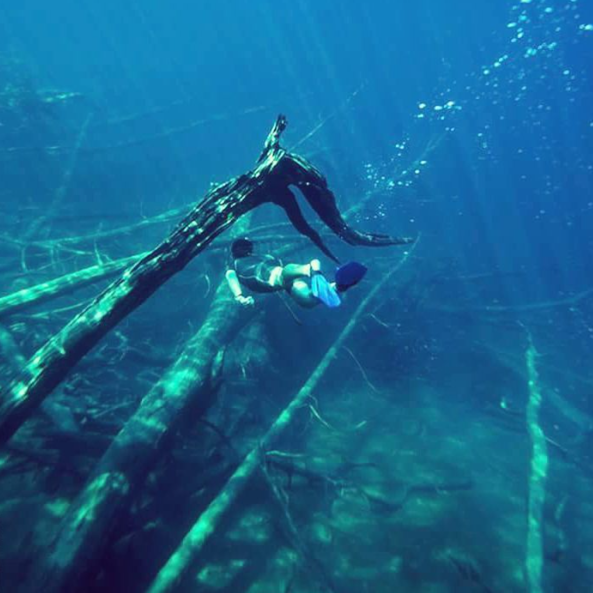 Con una mínima experiencia previa se puede contratar la excursión subacuática para bucear en las profundidades del lago y entre los majestuosos árboles del sorprendente bosque.