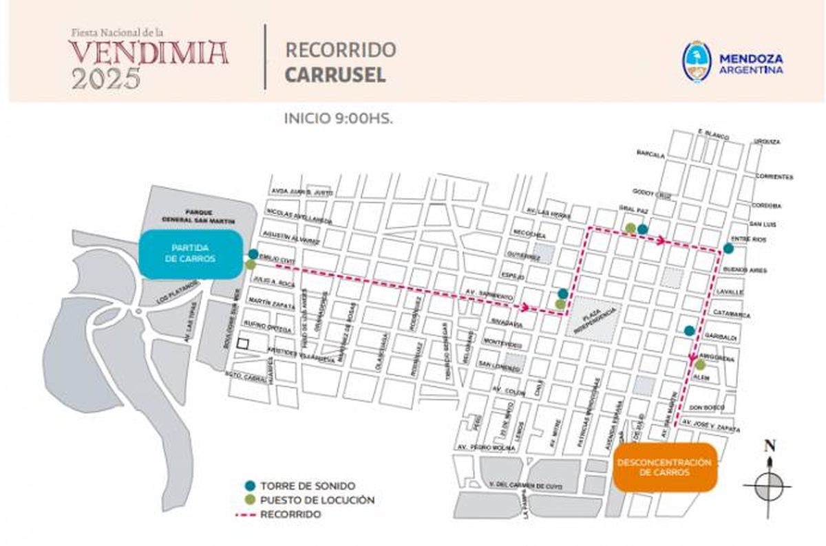 Desde los Portones del Parque General San Martín el Carrusel se dirigió hacia el Este por Emilio Civit hasta la plaza Independencia, allí dobló hacia el Norte por calle Chile hasta la avenida Las Heras, y desde ahí continuará hasta San Martín hacia el Sur para luego llegar a la esquina con calle Colón y desconcentrar.