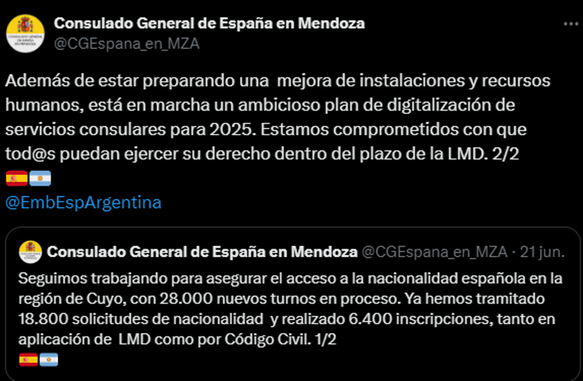 El Consulado General de España en Mendoza recibe mensualmente 5.000 solicitudes para tramitar la ciudadanía de España, a través de la Ley de Nietos. Para canalizar la importante demanda de toda la zona de Cuyo, el organismo habilitó 28.000 nuevos turnos y tiene previsto aumentar tanto los recursos humanos como la capacidad tecnológica para llegar a las 70.000 peticiones procesadas a fines de 2025.