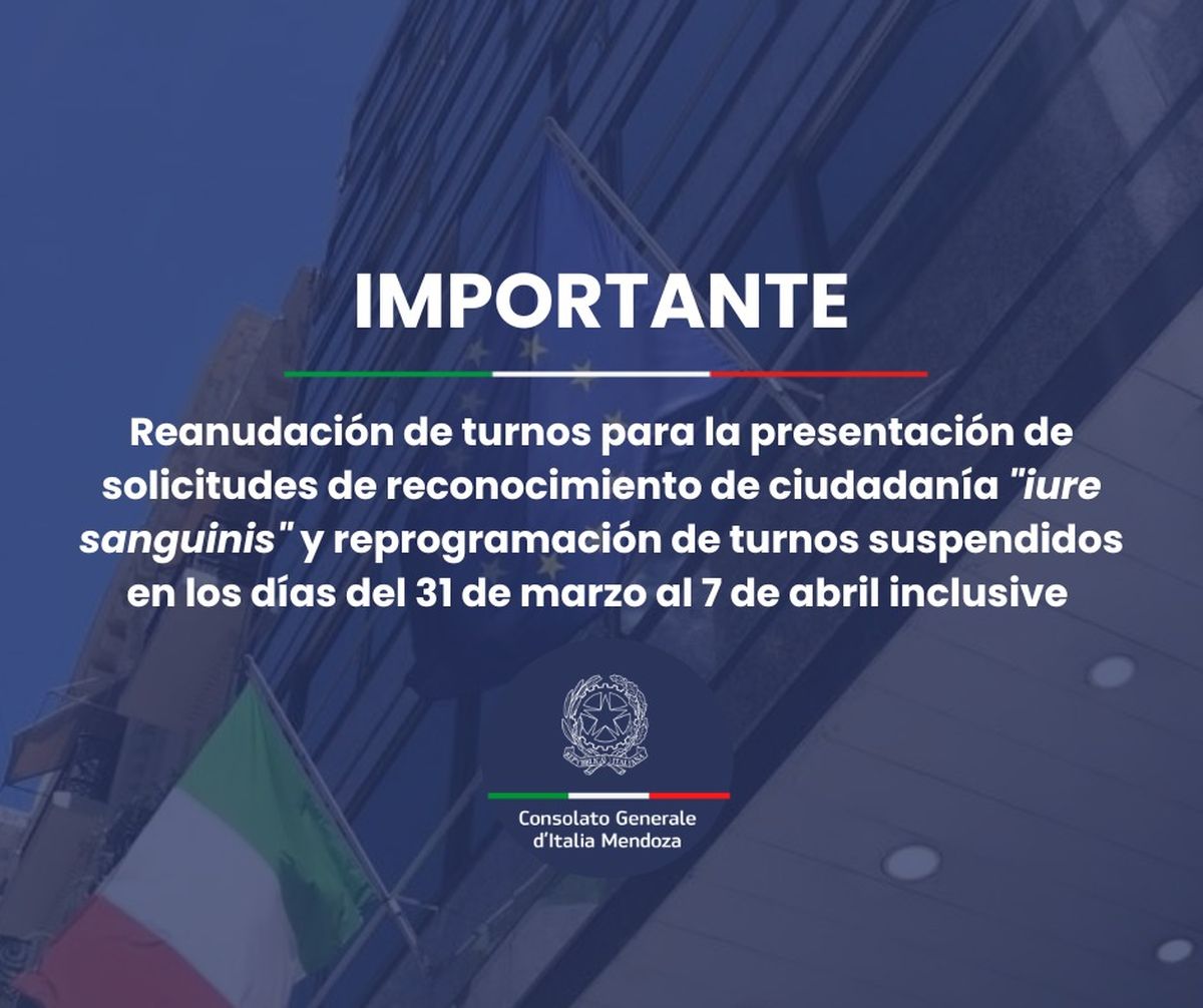 La página oficial del Consulado de Italia en Mendoza informó que se reprogramaron los turnos que quedaron suspendidos entre el 31 de marzo y el 7 de abril inclusive y que se convocará por e-mail a los interesados desde el 8 de abril. Además se retomarán aquellos que ya estaban programados.