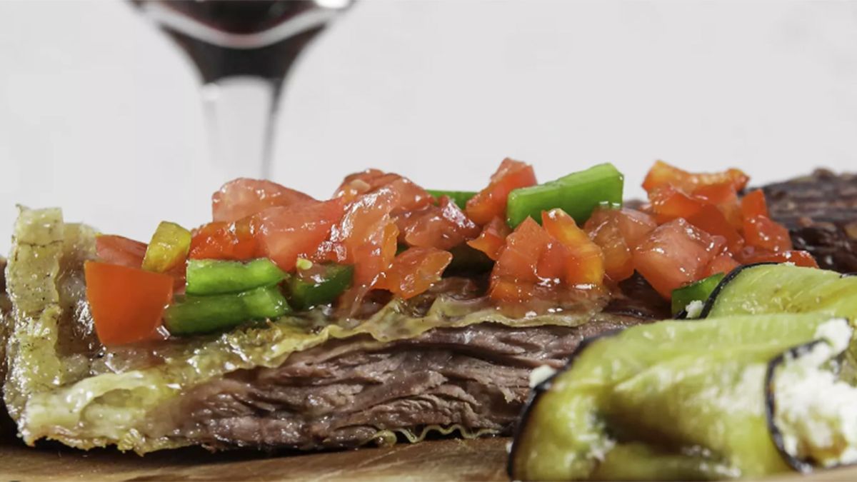 Esta cima -o falsa entraña- a la parrilla con rollitos de berenjena rellenos se acompaña con una buena salsa criolla, aunque hay quienes optan por la salsa barbecue.