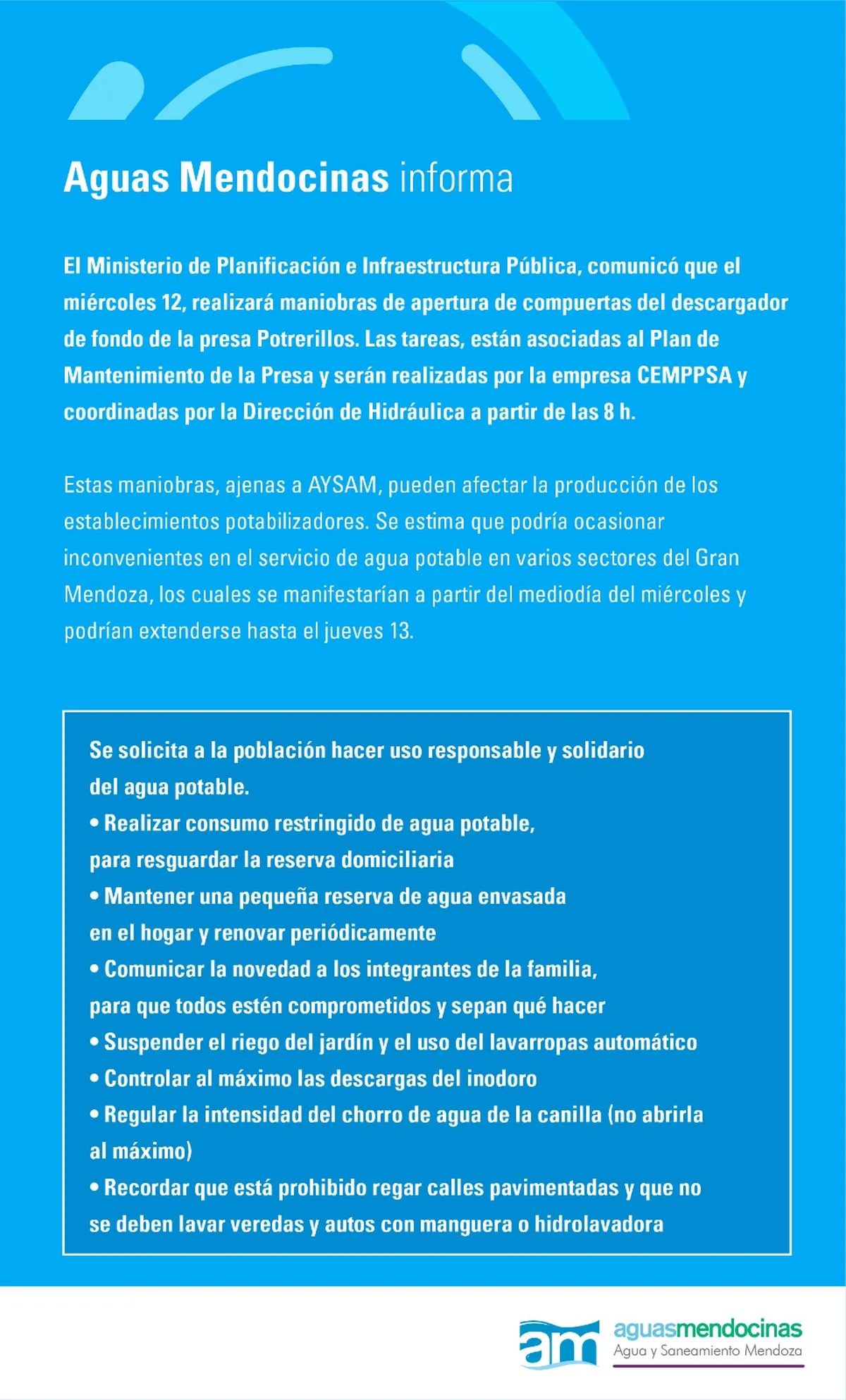 Estas maniobras, según advirtieron, pueden afectar la producción de los establecimientos potabilizadores y por lo tanto pueden causar inconvenientes en el servicio de agua potable en varios sectores del Gran Mendoza, que se extenderán durante la jornada de este miércoles 12 de julio y podrían llegar hasta el jueves 13.