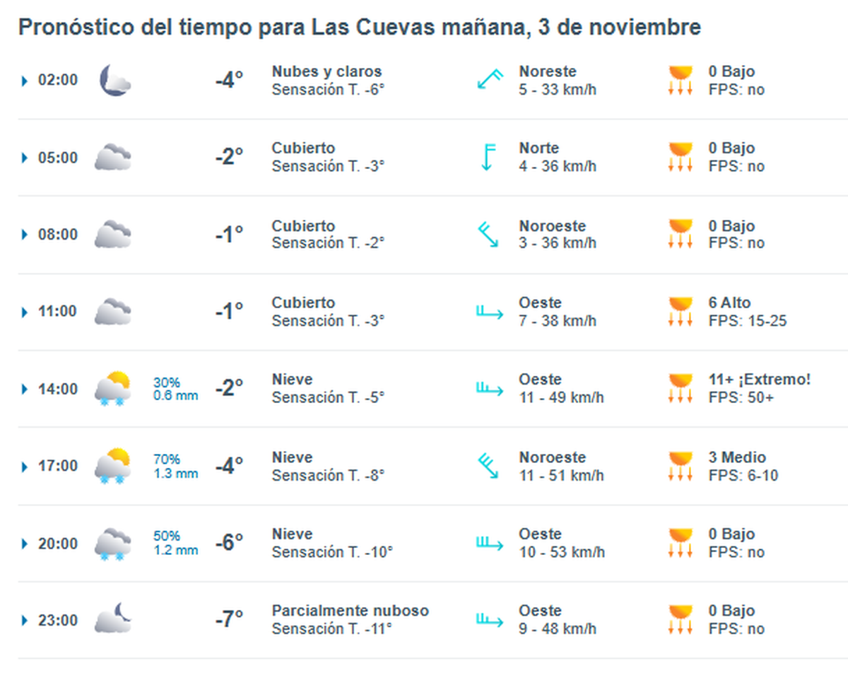 Sin embargo, datos de la página del pronóstico extendido Meteored, indican que este domingo 3 de noviembre existe la probabilidad de nevadas, entre las 17 y las 20.