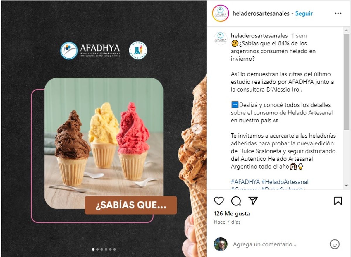 Según el estudio realizado por la Asociación de Fabricantes Artesanales de Helados y Afines (AFADYHA) en conjunto con la consultora D'Alessio Irol el consumo promedio de helado anual per cápita es de 7,3 kilos y además el 84% de quienes fueron encuestados reconocieron “tomar helado durante el invierno”.