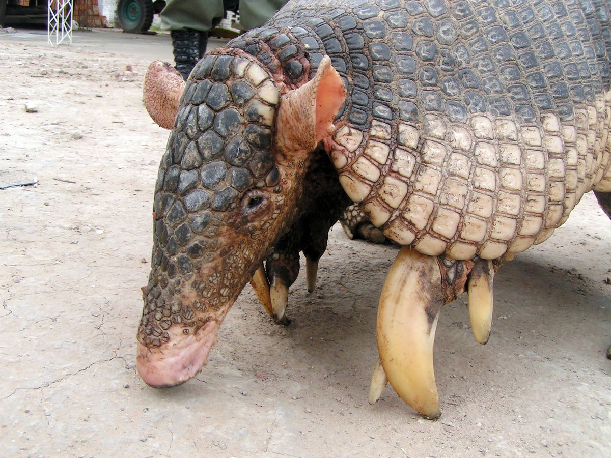El armadillo gigante es uno de los animales más llamativos de la naturaleza. Puede llegar a pesar unos 60 kilos y medir más de 160 centímetros. A pesar de verse inofensivo, sus uñas pueden llegar a medir 20 centímetros y son muy poderosas. No obstante, no es carnívoro ni violento, ya que se alimenta de insectos, lombrices y gusanos.