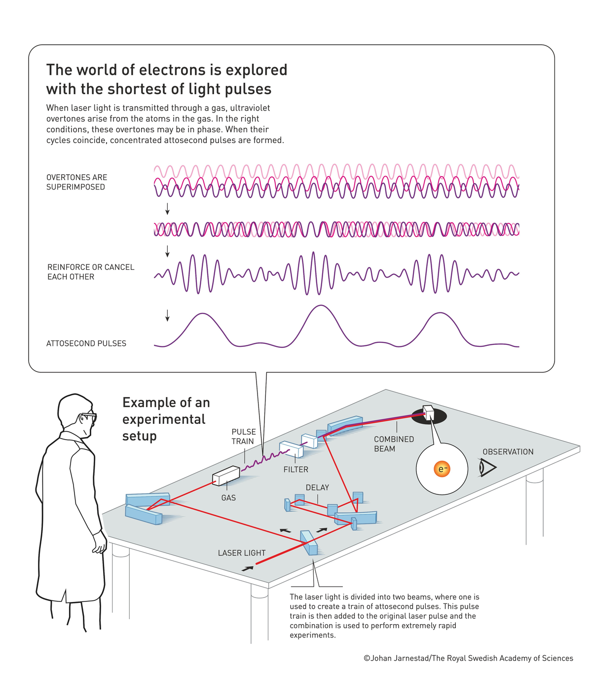 El anuncio continuó: "En el mundo de los electrones, los cambios ocurren en unas pocas décimas de attosegundo; un attosegundo es tan corto que hay tantos en un segundo como segundos ha habido desde el nacimiento del universo".
