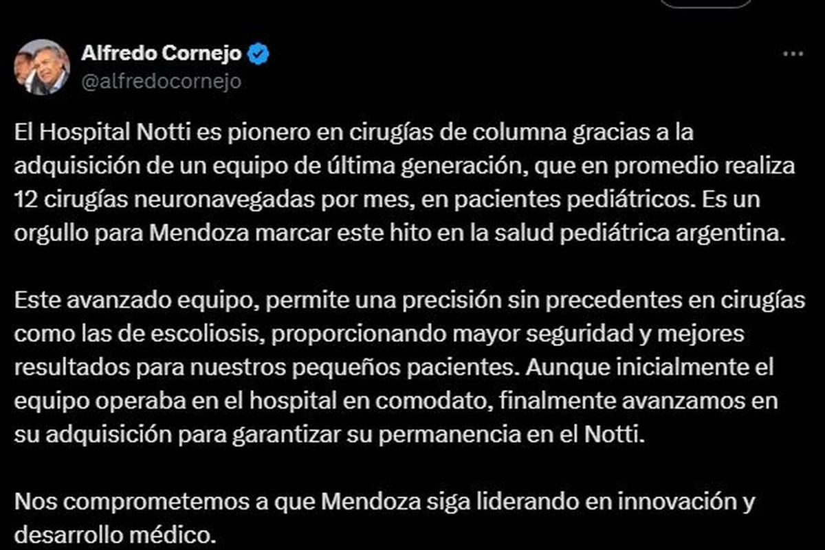 El anuncio de la compra de los instrumentos quirúrgicos fue realizado por el gobernador Alfredo Cornejo a través de su cuenta de X.