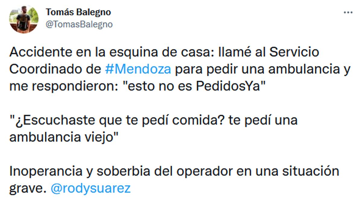 Cuando llamó, le explicó con detalles lo que pasaba, y recibió la insólita respuesta del operador: "Esto no es Pedidos Ya". Tomás le insistió que había una mujer que no reaccionaba, y le volvió a pedir que llegara la ambulancia lo más rápido posible, pero volvió a conseguir la misma respuesta. "¿Escuchaste que te pedí comida? te pedí una ambulancia, viejo", le retrucó Tomás.