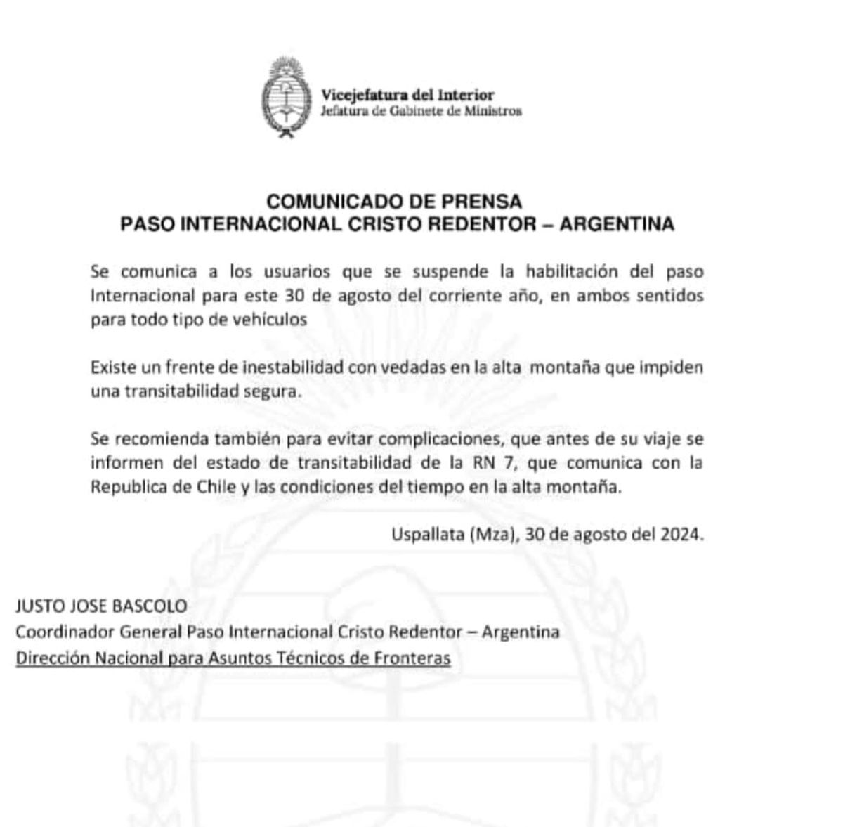 "Se comunica a los usuarios que se suspende la habilitación del paso Internacional para este 30 de agosto del corriente año, en ambos sentidos para todo tipo de vehículos", reza el documento oficial. Y explica que "existe un frente de inestabilidad con nevadas en la alta montaña que impiden una transitabilidad segura".