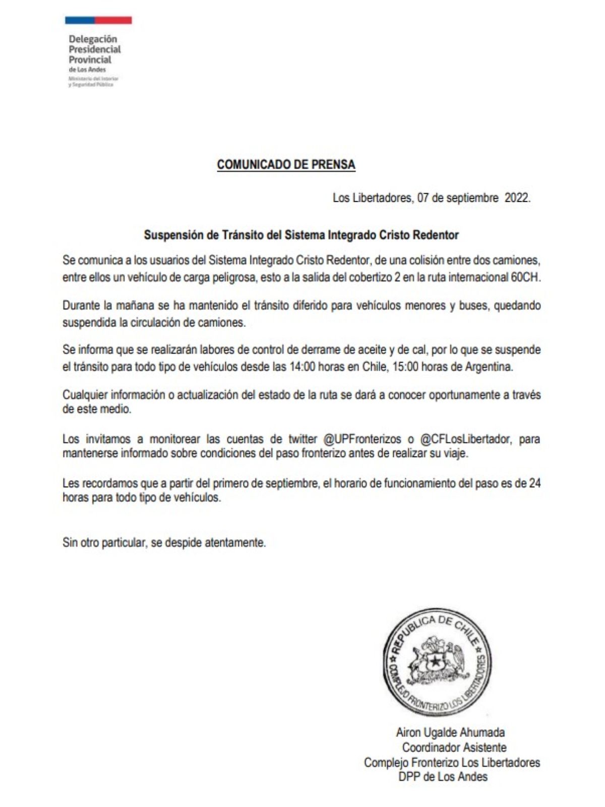Las autoridades chilenas, de acuerdo con las argentinas, decidieron cerrar completamente la circulación desde las 15 -hora argentina- y hasta que se complete la limpieza del material derramado: cal y aceite. Pasadas las 17, continuaba el cierre.
