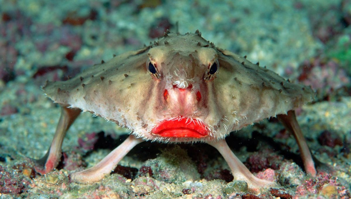 Este singular habitante del mar ha evolucionado para moverse de forma terrestre en un entorno marino. Su locomoción se parece más a la de un animal terrestre que a la de un nadador tradicional. Además, sus intensos labios rojos han generado hipótesis sobre su función: algunos científicos creen que podrían usarse para atraer pareja o despistar a los depredadores.