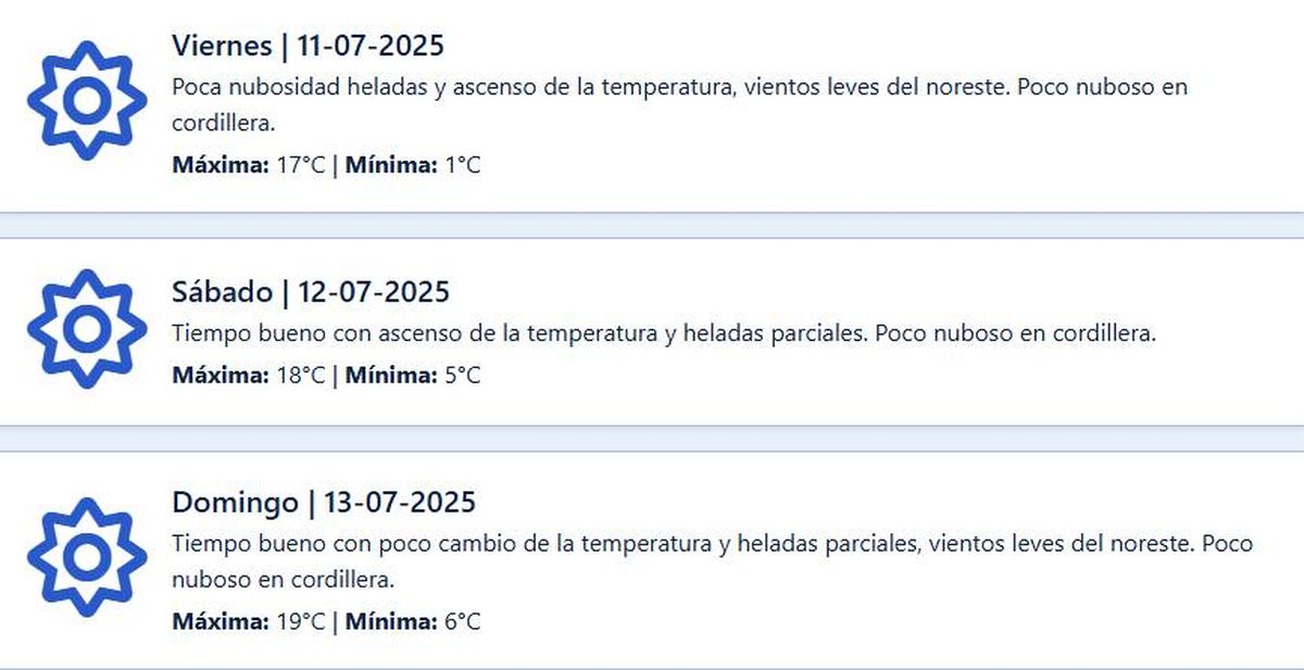 Para este domingo, se espera tiempo bueno con poco cambio de la temperatura y heladas parciales, vientos leves del noreste. Poco nuboso en cordillera.