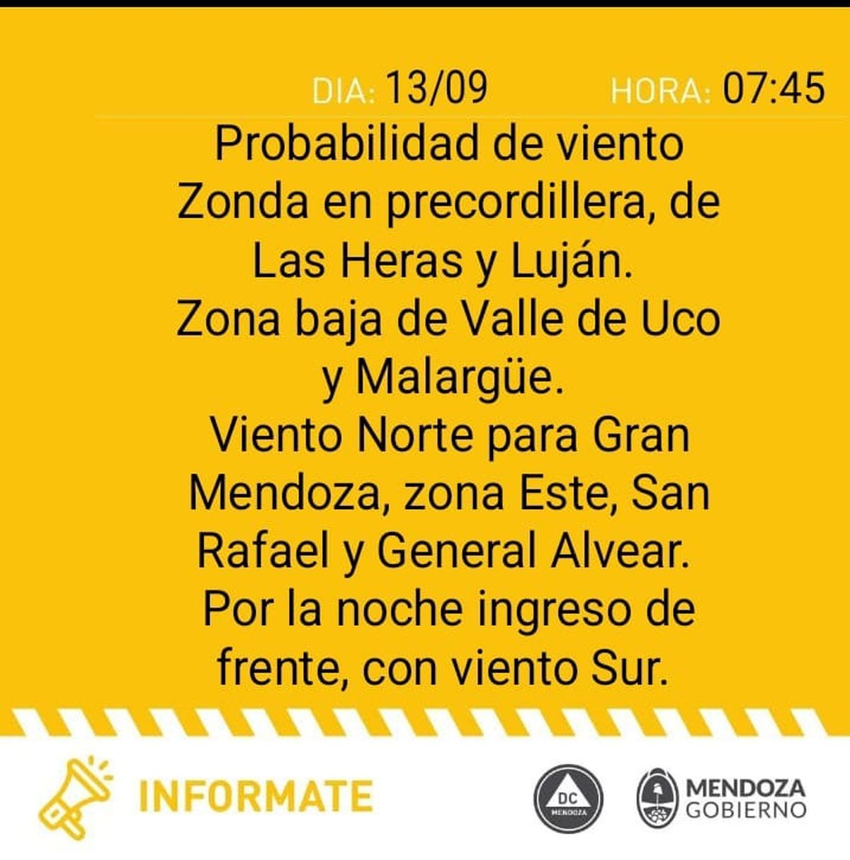 Para el Gran Mendoza, la zona Este, San Rafael y General Alvear se espera viento del Norte y por la noche el ingreso de un frente con viento del Sur que hará bajar las temperaturas.