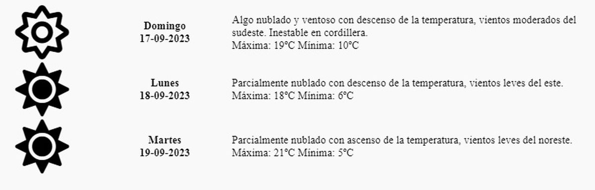 Domingo: Algo nublado y ventoso con descenso de la temperatura, vientos moderados del sudeste. Inestable en cordillera. Máxima: 19º