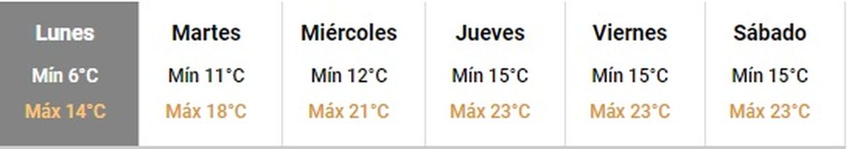 Para este lunes anticipa que la que la temperatura máxima probable será de 14º y la mínima de 6º, con el cielo de parcial a mayormemente nublado y vientos del sudeste.