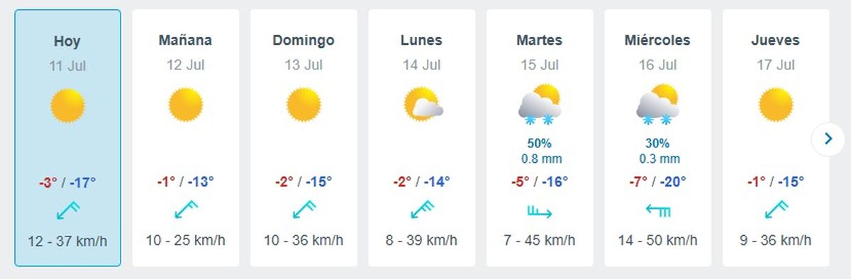 Las temperaturas máximas serán de entre -1º y -7ºC y las mínimas oscilarán entre -13ºC y -20ºC en la zona del paso a Chile.