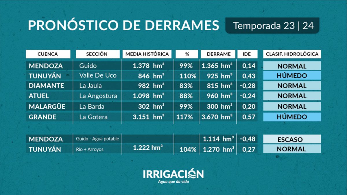 Irrigación presentó oficialmente el Pronóstico de Caudales de los ríos de la provincia de Mendoza para la temporada 2023-2024, elaborado por la Dirección de Gestión Hídrica. "Hemos tenido una buena temporada de nieve en la montaña y eso nos permitirá transitar un año normal en todos los ríos", dijo Sergio Marinelli, el titular del organismo.