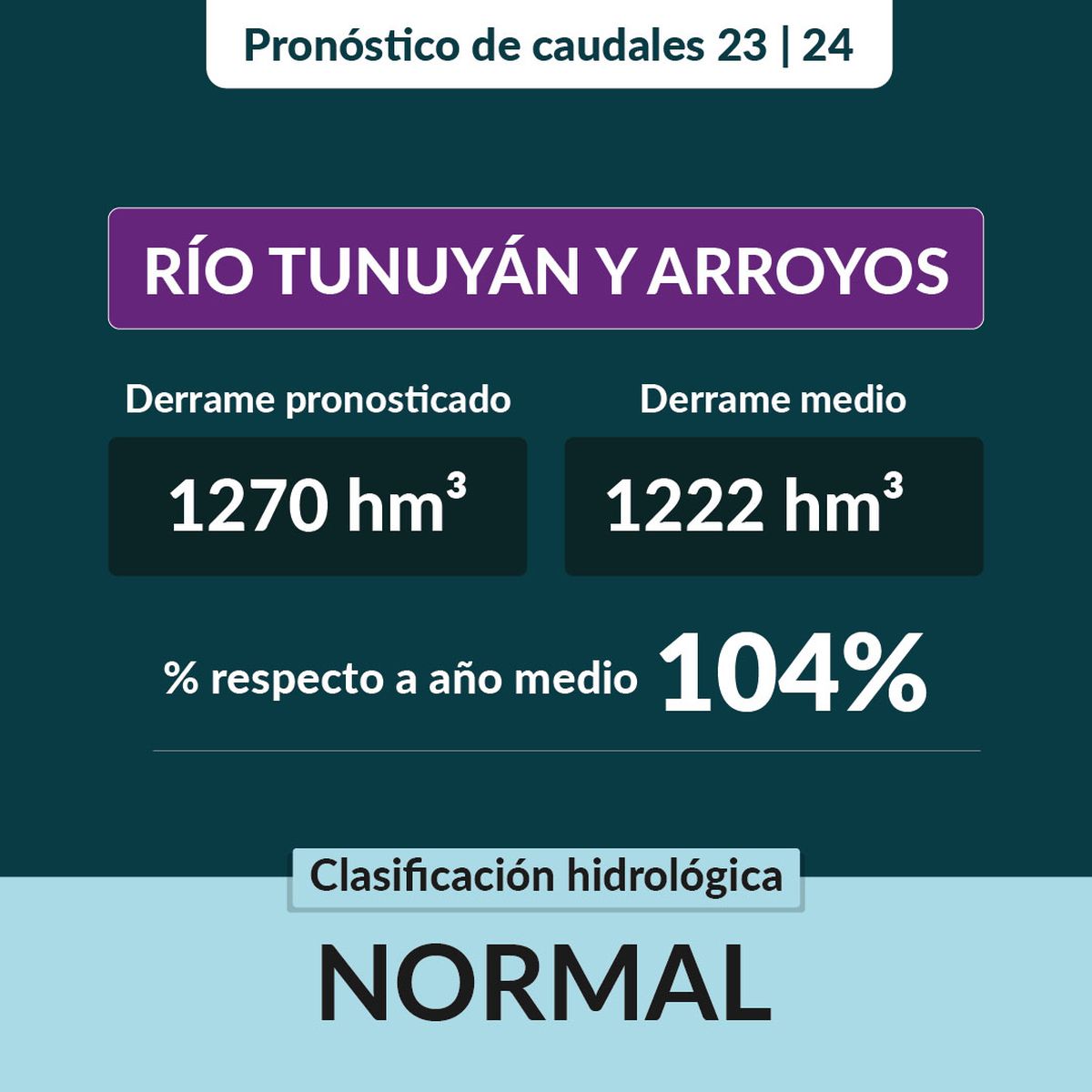 -El pronóstico de Escurrimientos para el río Tunuyán más el aporte de los arroyos, indica que se espera un derrame de 1.270 hm3, lo que representa un 104% de un año medio.