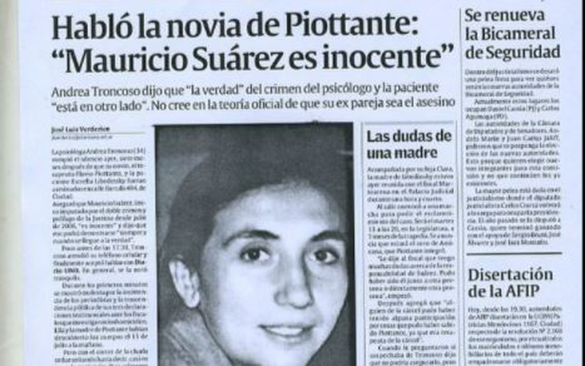 Incluye, además, las declaraciones de testigos -ahí la figura de Suárez asomó como sospechoso por haber sido ex esposa de la novia de Piottante-; registros de llamados telefónicos, fotos de las autopsias, informes reservados, la sospecha de que pudo haber estado en Chile, datos sobre sus finanzas y un informe del especialista forense Gerardo Mazzioti.