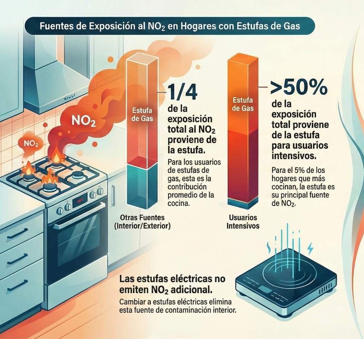 El trabajo, publicado en PNAS Nexus, indica un hallazgo: la sustitución de una cocina a gas por una eléctrica reduce la exposición personal al dióxido de nitrógeno en más del $25\%$ en promedio, y alcanza hasta la mitad en las viviendas donde la estufa se usa con mayor frecuencia. Esta disminución resulta crucial, considerando que el dióxido de nitrógeno se asocia al asma, la enfermedad pulmonar obstructiva, partos prematuros y ciertos cánceres. Adicionalmente, el gas también emite benceno, un carcinógeno ampliamente reconocido.