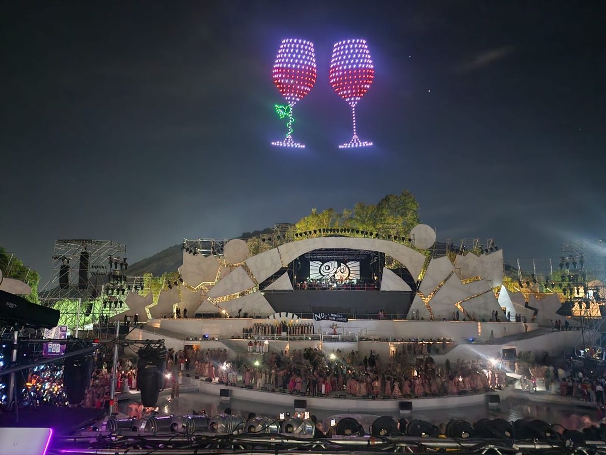 Los dispositivos comenzaron formando el logo de "90 Vendimia 2026" y luego pasaron a representar a los viñateros, los hacedores fundamentales de la fiesta.