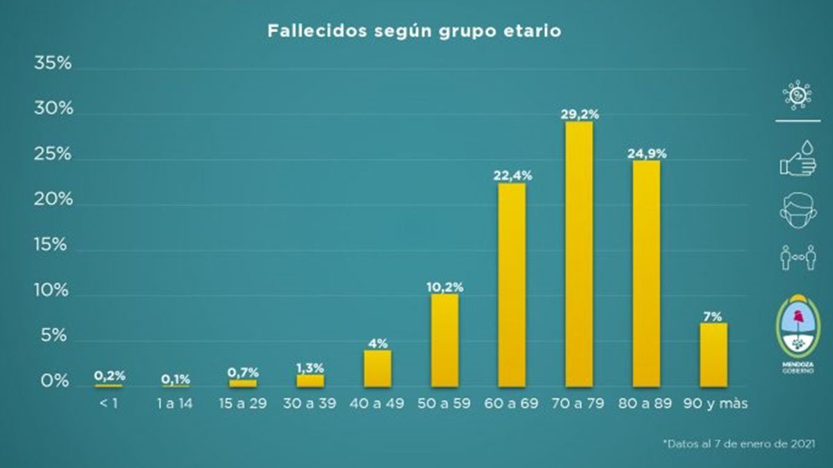 Asimismo, el grupo etario más vulnerable frente a la enfermedad sigue siendo el de los adultos mayores. El 76,5% de los fallecidos tiene entre 60 años y 89 años y las personas de más de 90 años representa el 7%.