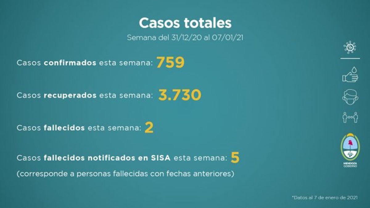 La semana del 1 al 7 de enero 2021: 759 confirmados, 3.730 recuperados, 2 fallecidos y 5 casos fallecidos notificados en SISA esta semana (corresponde a personas fallecidas con fechas anteriores).