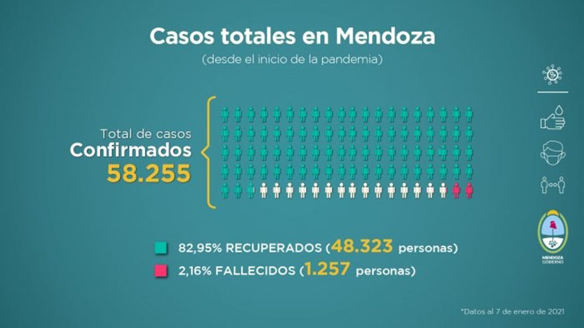 Desde que comenzó la pandemia en Mendoza son: 58.255 confirmados, 48.323 recuperados y 1.257 fallecidos.