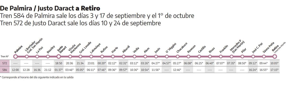 Durante septiembre el tren Retiro-Palmira saldrá los viernes 1, 15 y 29 y el de Palmira-Retiro los domingos 3 y 17 de septiembre. Se suma el 1 de octubre.