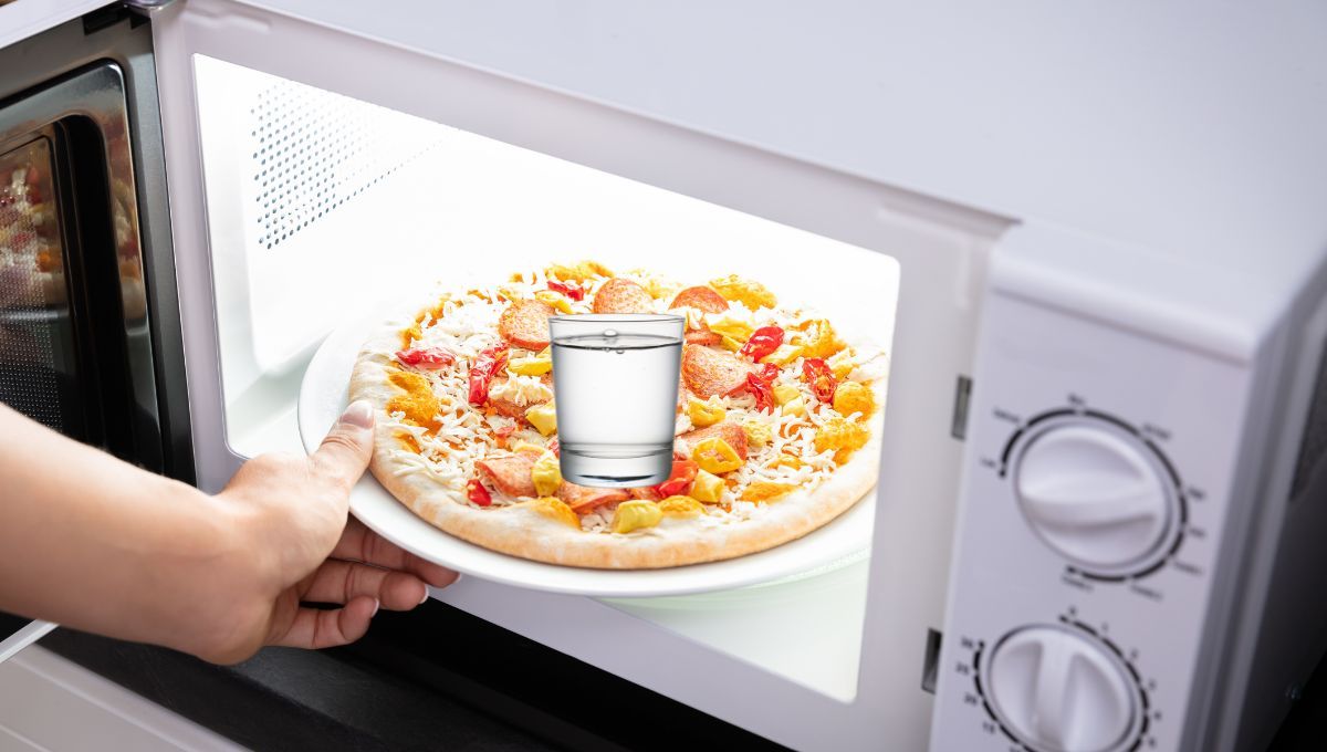 - Vaso de agua en el microondas junto con la pizza, lo que ayuda a mantener la humedad y evita que la masa se vuelva gomosa.