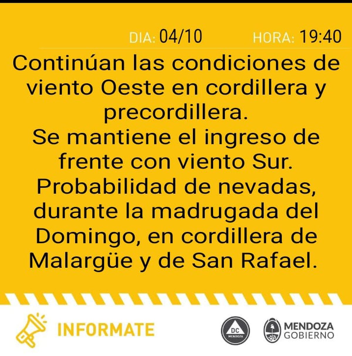 La Dirección de Contingencias Climáticas informó que luego de la ocurrencia de viento Zonda en alta montaña, este sábado en la noche ingresará un frente frío que hará descender la temperatura. El pronóstico anticipa que continuarán las condiciones de inestabilidad en la cordillera y en la precordillera para este domingo 5 de octubre. El Zonda afectó a los departamentos de Luján de Cuyo, Rivadavia y Lavalle con la afectación en cortes de luz y árboles y postes caídos.